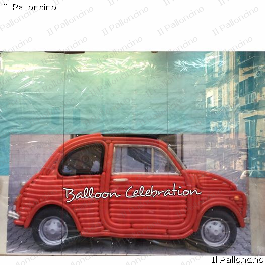 La scultura di palloncini è stata realizzata con le dimensioni reali della macchina FIAT 500, utilizzando i palloncini COD. D2 e D4 prodotti dalla Gemar Balloons, azienda leader nella produzione dei palloncini in lattice.